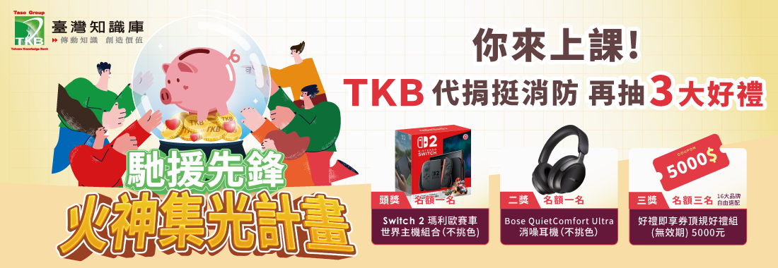 凡於活動期間,報名TKB全品項的課程,並於當月繳清者,TKB台灣知識庫就幫您捐出學費的千分之三,回饋消防人員,協助抗災,學費達指定金額者,即符合抽獎資格,就有機會將好禮帶回家。![]() | ![]() | ![]() |